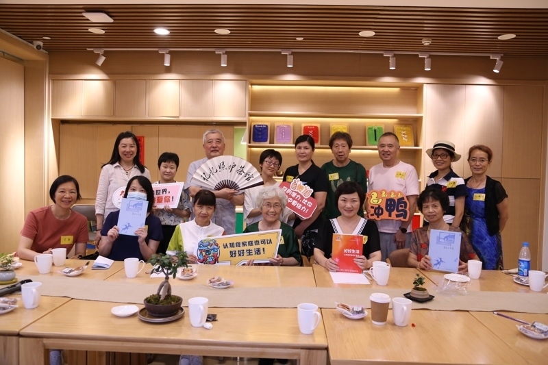 她希望能給他們提供彼此支持、交流經(jīng)驗(yàn)的社交平臺(tái)。而她也漸漸發(fā)現(xiàn)最了解家屬需求的是他們自己。為什么不能由家屬自己來決定討論什么呢?于是,2020年,汪達(dá)民與顧春玲一拍即合,在延續(xù)國(guó)外“記憶咖啡館”理念的基礎(chǔ)上,開創(chuàng)了本土特色的認(rèn)知癥家屬互助平臺(tái):照護(hù)茶館。畢竟,茶館就是熱鬧的、七嘴八舌的,人們來這里消遣娛樂,釋放壓力。在照護(hù)茶館里,家屬們既是掌柜也是茶客,分享各種照護(hù)信息,這也是認(rèn)知癥患者照護(hù)者們希望得以喘息的方式。