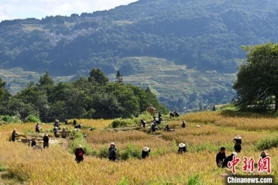 23日,正值秋分時節(jié),也是第六個中國農(nóng)民豐收節(jié),哈尼梯田染上了豐收的色彩。哈尼人民在金黃的稻田里割水稻、捉稻花魚,與四方賓客共慶豐收。為了慶祝豐收,當(dāng)?shù)剡€舉行了大型稻作農(nóng)耕實景表演。身著民族服飾的哈尼族民眾站在田埂上,以稻田為舞臺,以大地山川為背景,唱起悠揚(yáng)的哈尼古歌,手捧水稻,載歌載舞,表達(dá)崇尚自然、感恩自然之情。