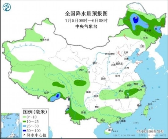 7月5日08時(shí)至6日08時(shí),內(nèi)蒙古東北部、黑龍江、吉林北部以及江西北部、安徽南部、川西高原北部、云南西部和南部、西藏東南部等地部分地區(qū)有中到大雨,其中,內(nèi)蒙古東北部、西藏東南部等地部分地區(qū)有暴雨(50~65毫米)。內(nèi)蒙古中東部、華北北部和東部、山東半島、東北地區(qū)北部和南部等地部分地區(qū)有4~6級風(fēng)。