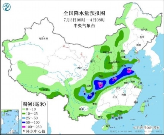 7月3日08時(shí)至4日08時(shí),山東中南部、江蘇北部、安徽北部、河南東部和南部、湖北北部和西部、陜西南部、重慶、四川東部、貴州西北部、云南東北部以及廣東西南部沿海等地部分地區(qū)有大到暴雨,其中,山東南部、江蘇北部、河南南部、重慶北部、四川東北部等地局地有大暴雨(100~160毫米)。內(nèi)蒙古中西部、甘肅中北部、青海北部等地部分地區(qū)有4~6級風(fēng)。