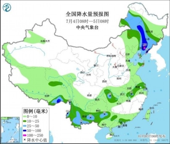 7月4日08時(shí)至5日08時(shí),內(nèi)蒙古東部、黑龍江南部、吉林、遼寧以及蘇皖南部、湖北西南部、湖南北部、廣東南部、廣西北部和西部、云南大部、西藏東南部等地部分地區(qū)有中到大雨,其中,內(nèi)蒙古東北部、黑龍江西南部、吉林中西部、遼寧中東部、西藏東南部等地部分地區(qū)有暴雨或大暴雨(100~120毫米)。內(nèi)蒙古、華北北部和西部、黃淮東部、東北地區(qū)南部等地部分地區(qū)有4~6級風(fēng)。
