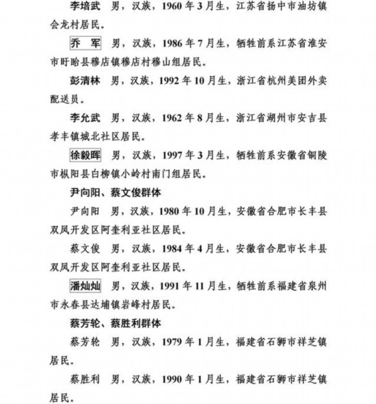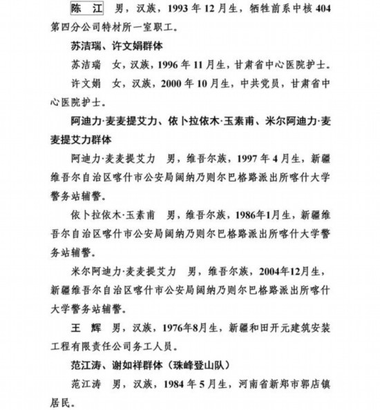 上榜勇士中,有從高橋上跳水救人導(dǎo)致胸椎骨折的外賣小哥彭清林和另一位高橋跳水救人的中學(xué)教師丁成闖;有冒著9級大風(fēng)在海上營救遇險臺胞的漁民蔡芳輪、蔡勝利;有放棄登頂珠峰機(jī)會而救助同胞的珠峰登山隊(duì)隊(duì)員范江濤、謝如祥;有萬米高空機(jī)艙里搶救瀕危病人的護(hù)士長劉素琴;有勇斗盜賊被刺幾刀仍不退縮的江蘇村民李培武;有身患癌癥卻橫渡淥江河救人的樂觀大姐鐘慧慈;有跳進(jìn)充滿沼氣深井救人致多器官感染的山東小伙李字旭;更有冒死救援落水群眾壯烈犧牲的潘燦燦、朱先鴿、尹新朋、喬軍、徐毅暉、楊華清、陳江七位勇士,讓我們致以最崇高的敬意!