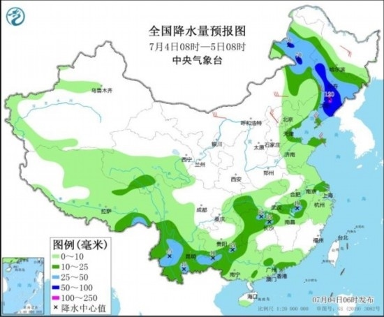 7月4日08時(shí)至5日08時(shí),7月4日08時(shí)至5日08時(shí),內(nèi)蒙古東北部、黑龍江西南部、吉林、遼寧中東部、云南西部和南部等地部分地區(qū)有大到暴雨,其中,遼寧東北部等地局地有大暴雨(100~120毫米)。內(nèi)蒙古、黑龍江、遼寧、河北北部、山東半島等地部分地區(qū)有4~6級風(fēng)。