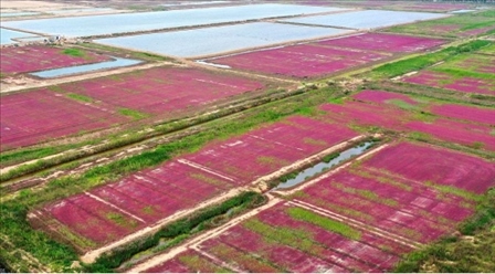 盛夏時(shí)節(jié),連云港市灌云縣燕尾港沿海灘涂濕地大片野生鹽蒿漸紅,如一片片紅毯鋪呈大地,美不勝收。