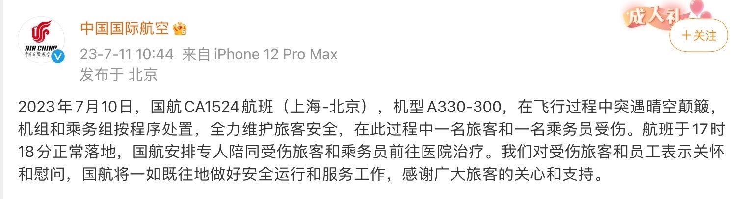 7月11日,中國國際航空在其官方微博發(fā)布通報:2023年7月10日,國航CA1524航班(上海-北京),機型A330-300,在飛行過程中突遇晴空顛簸,機組和乘務(wù)組按程序處置,全力維護(hù)旅客安全,在此過程中一名旅客和一名乘務(wù)員受傷。航班于17時18分正常落地,國航安排專人陪同受傷旅客和乘務(wù)員前往醫(yī)院治療。