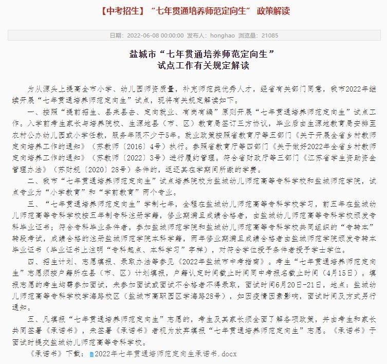 記者從鹽城幼兒師范高等??茖W校官網(wǎng)看到,鹽城市從2021年起開始試點培養(yǎng)“七年貫通師范定向生”,試點培養(yǎng)院校為鹽城幼兒師范高等??茖W校和鹽城師范學院,試點專業(yè)為“小學教育”和“學前教育”兩個專業(yè)。