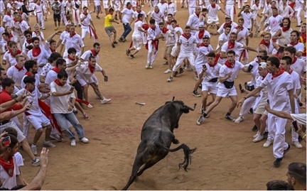 當(dāng)?shù)貢r(shí)間2023年7月10日,西班牙潘普洛納,圣費(fèi)爾明節(jié)期間,狂歡者站在公牛周?chē)_M(jìn)入斗牛場(chǎng)。