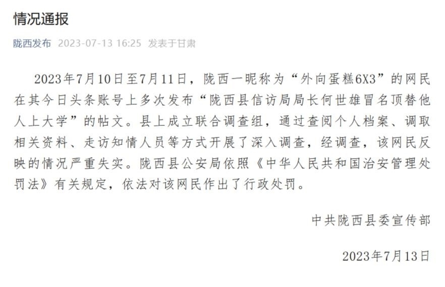 ·信訪局局長被舉報冒名頂替他人上大學,甘肅隴西縣通報:嚴重失實!