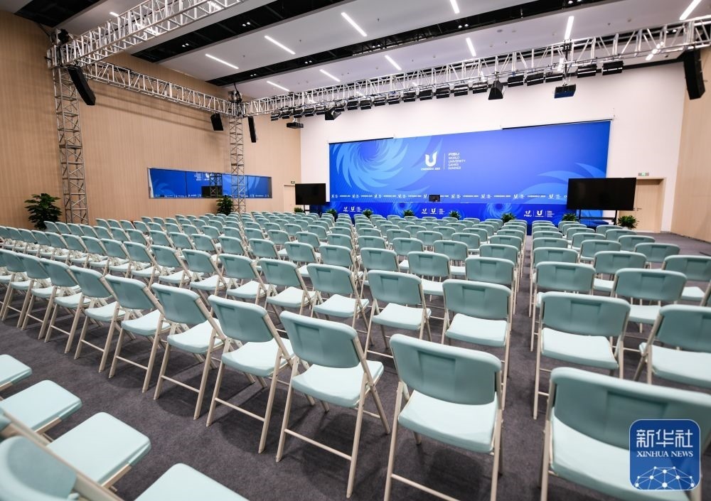 ↑這是7月13日拍攝的成都大運會主媒體中心新聞發(fā)布廳。新華社記者 王曦 攝