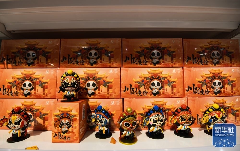 ↑這是7月13日拍攝的成都大運會主媒體中心大運會官方特許商品零售店展出的“蓉寶”川劇變臉造型玩偶。新華社記者 王曦 攝