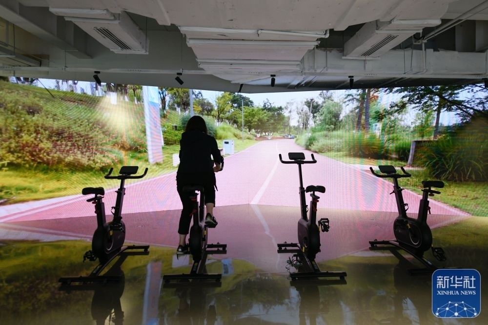 ↑7月14日,媒體工作人員在成都大運會主媒體中心休閑娛樂區(qū)內(nèi)體驗騎行。新華社記者 胥冰潔 攝