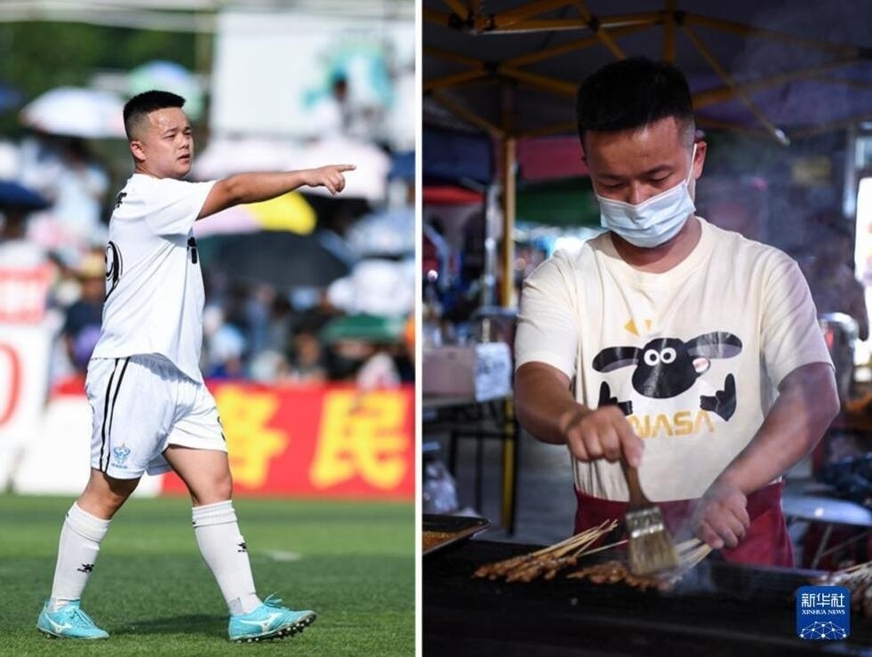 貴州“村超”球員的“雙面人生”。左圖為7月15日,六佰塘村足球隊(duì)球員楊宗維在比賽中組織進(jìn)攻;右圖為7月16日,楊宗維在燒烤攤給客人烤肉串。