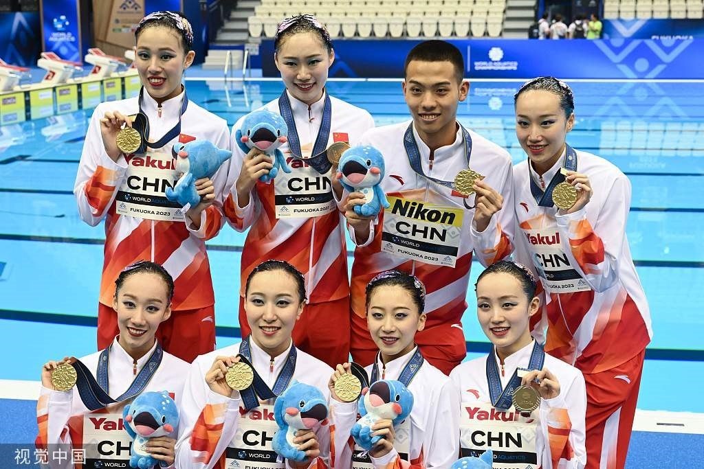 7月17日,2023年福岡游泳世錦賽,石浩玙(后排右二)隨中國(guó)隊(duì)拿下花游集體技巧自選項(xiàng)目金牌。