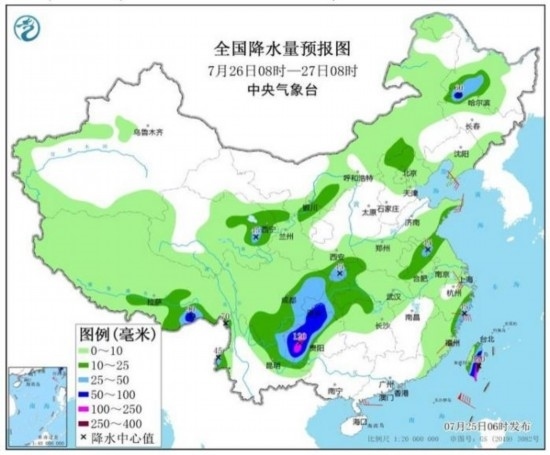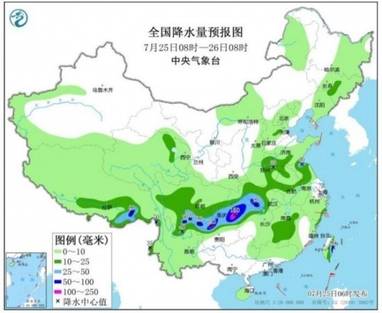 預(yù)計(jì),7月25日08時(shí)至26日08時(shí),重慶中南部、四川南部、云南東北部、貴州北部、湖南西北部、湖北西部以及江蘇北部、西藏東南部、臺灣島東部等地的部分地區(qū)有大到暴雨,其中,重慶東南部、四川南部、貴州北部等地局地有大暴雨(100~150毫米)(見圖1);上述部分地區(qū)伴有短時(shí)強(qiáng)降水(最大小時(shí)降雨量20~50毫米,局地可超過70毫米),局地有雷暴大風(fēng)等強(qiáng)對流天氣。中央氣象臺7月25日06時(shí)繼續(xù)發(fā)布暴雨藍(lán)色預(yù)警。