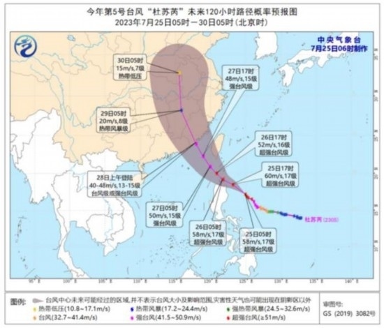 圖2 臺風(fēng)“杜蘇芮”未來120小時(shí)路徑概率預(yù)報(bào)圖(7月25日05時(shí)-30日05時(shí))