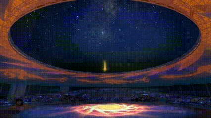 特效數(shù)字焰火與太陽神鳥金芒旋轉(zhuǎn)倒計(jì)時融合,依次出現(xiàn)“12、11……1”的倒計(jì)時數(shù)字,隨后一朵金色芙蓉花綻放。