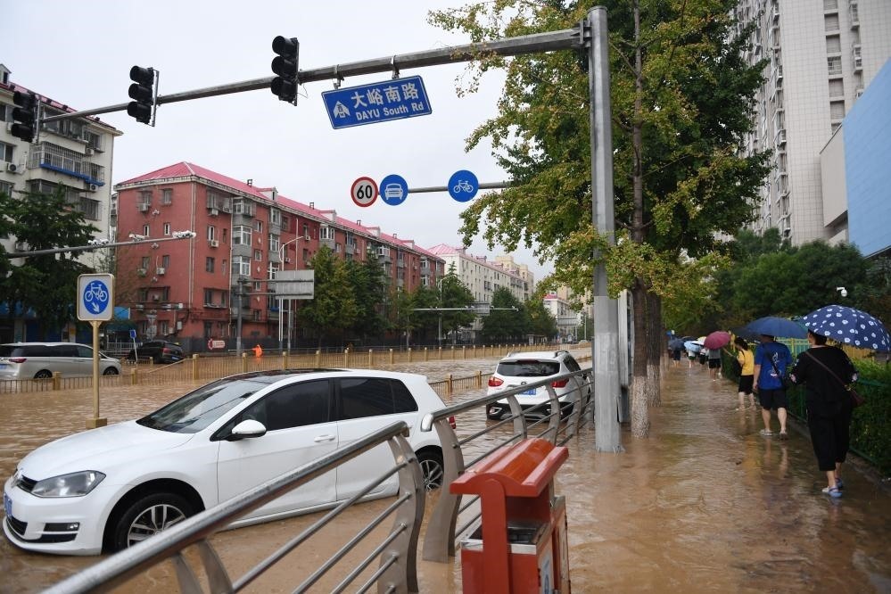 7月31日,在門頭溝區(qū)大峪南路,行人從積水的路面和泡水的車輛旁走過。新華社記者 鞠煥宗 攝