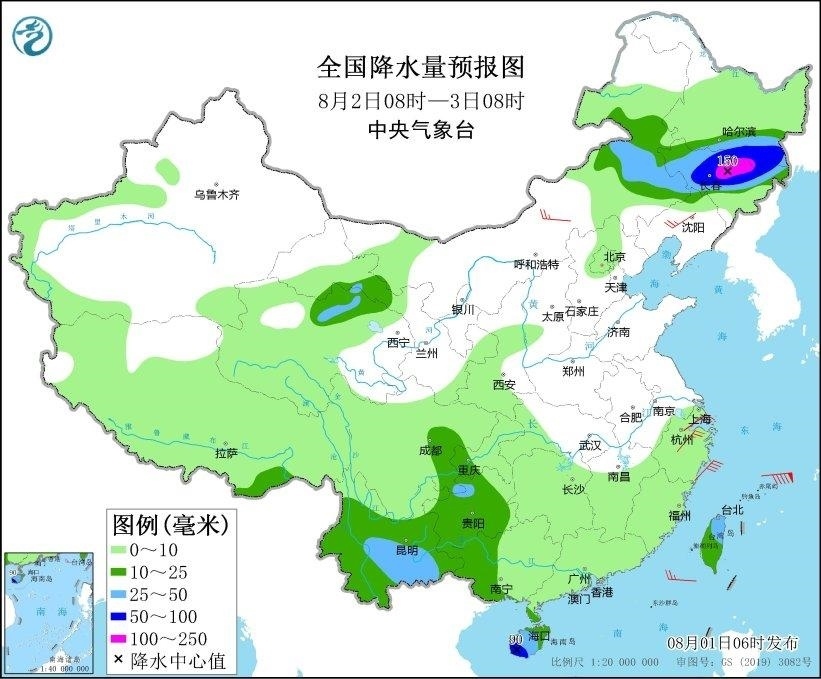 8月2日08時至3日08時,內(nèi)蒙古東部、黑龍江南部、吉林大部、青海北部、四川東部、貴州、云南、廣西西部、海南島、臺灣島等地部分地區(qū)有中到大雨,其中,黑龍江東南部、吉林中東部、海南島西南部等地局地有暴雨或大暴雨(100~150毫米)。遼寧中部、浙江北部等地部分地區(qū)有4~5級風(見圖2)。