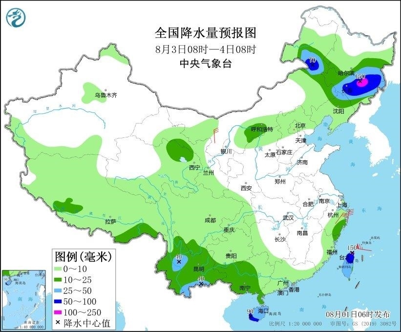 8月3日08時至4日08時,內(nèi)蒙古河套地區(qū)和東北部、黑龍江南部、吉林、西藏南部、云南、廣西中西部、海南島、臺灣島等地部分地區(qū)有中到大雨,其中,內(nèi)蒙古東北部、黑龍江東南部、吉林中東部、海南島西南部、臺灣島北部等地局地有暴雨或大暴雨(100~150毫米)。內(nèi)蒙古西北部、浙江北部等地部分地區(qū)有5~6級風(見圖3)。