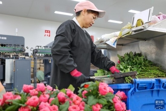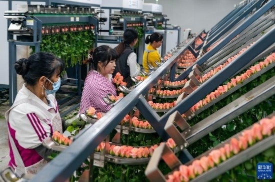 在云天化晉寧花卉產(chǎn)業(yè)現(xiàn)代化示范園內(nèi),花農(nóng)們將預(yù)冷處理后的鮮花放入自動(dòng)分揀流水線(7月12日攝)。新華社記者 崔文 攝