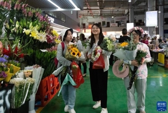 幾名外地游客在昆明斗南花卉市場(chǎng)內(nèi)購(gòu)買鮮花(7月13日攝)。新華社記者 陳欣波 攝
