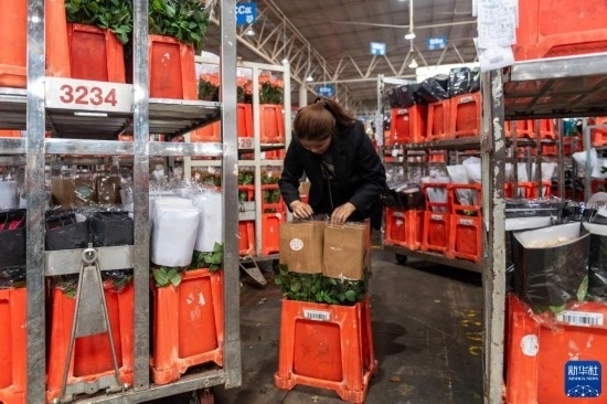 一名工作人員在昆明國(guó)際花卉拍賣交易中心內(nèi)對(duì)臺(tái)車上存放的鮮花進(jìn)行掃碼(7月13日攝)。新華社記者 陳欣波 攝