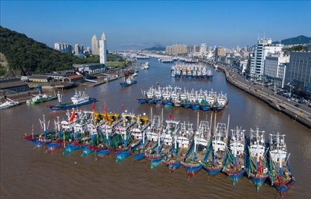 8月6日,停泊在舟山普陀沈家門漁港的漁船即將出港。專項特許捕撈漁船結束休漁,于6日開赴東海海域,進行捕撈作業(yè)。