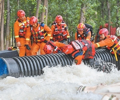 8月6日,在河北省涿州市刁窩鎮(zhèn)東張村,唐山消防救援支隊隊員進(jìn)行排澇作業(yè)。新華社記者 牟 宇攝