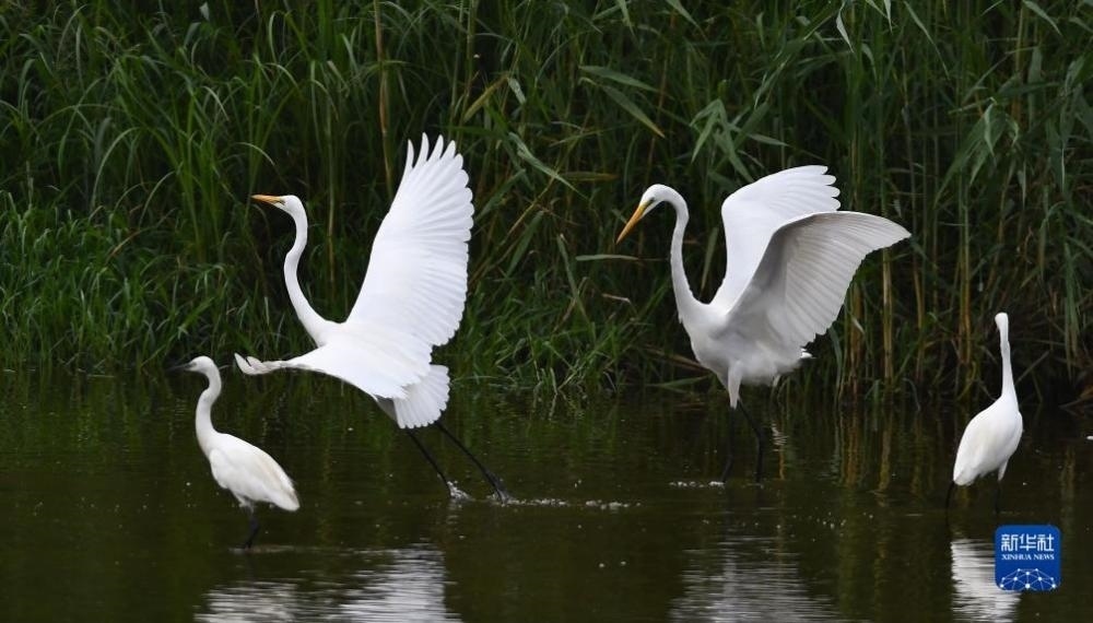 近日,成群的白鷺在山東省滕州市荊河水域覓食、飛舞。