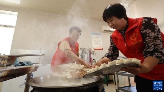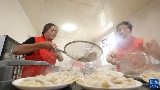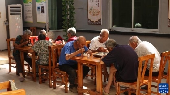 8月22日,老人們?cè)谇嗫h金牛鎮(zhèn)大鵓鴿留村孝老食堂用餐。