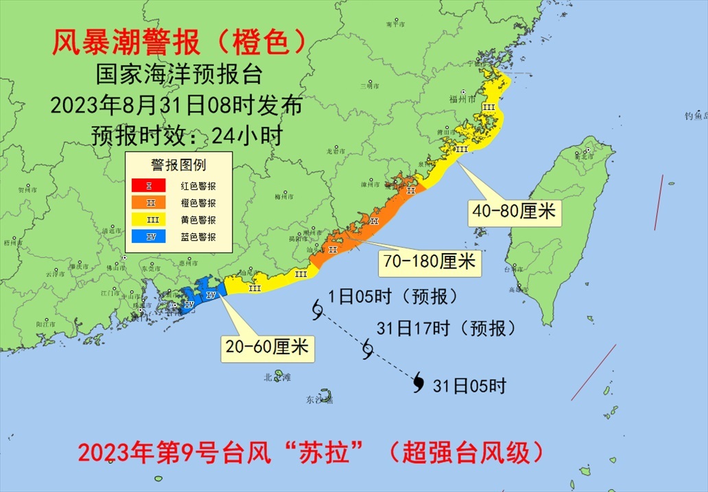 預(yù)計(jì)8月31日上午至9月1日中午,福建福州至泉州沿海將出現(xiàn)40到80厘米的風(fēng)暴增水,福建廈門至廣東汕尾沿海將出現(xiàn)70到180厘米的風(fēng)暴增水,廣東惠州和深圳沿海將出現(xiàn)20到60厘米的風(fēng)暴增水。福建省廈門市、漳州市、廣東省潮州市和汕頭市的風(fēng)暴潮預(yù)警級(jí)別為橙色,福建省福州市、莆田市、泉州市、廣東省揭陽市和汕尾市的風(fēng)暴潮預(yù)警級(jí)別為黃色。