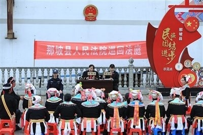 隆林各族自治縣人民法院以全國模范法官黃登林為榜樣,設(shè)立“登林巡回法庭”,創(chuàng)新運用黃登林“五大調(diào)解法”,開展壯漢、苗漢、彝漢等雙語巡回審判,滿足少數(shù)民族聚居地群眾的多元司法需求。同時,在德峨人民法庭打造“登林巡回法庭·崢嶸廳”和“民族團(tuán)結(jié)同心苑”等文化場館,開展雙語普法,奏響“最炫民族風(fēng)”司法文化品牌的新樂章。
