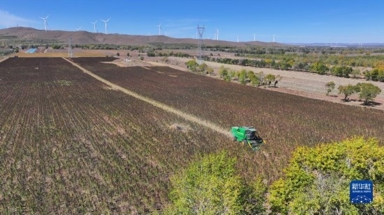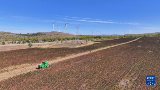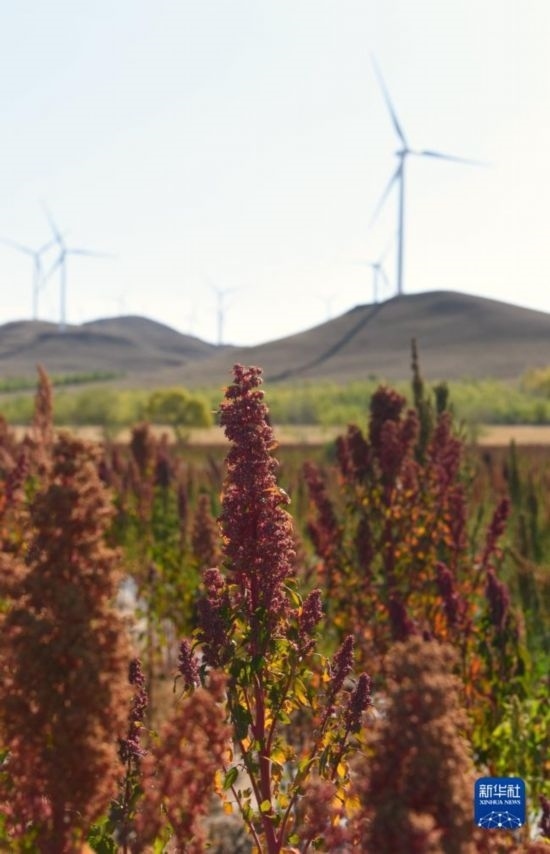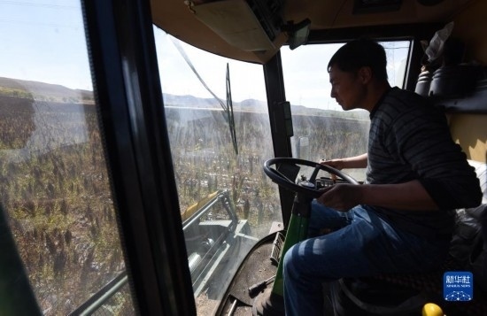 10月1日,在沽源縣白土窯鄉(xiāng)小西溝村,當(dāng)?shù)剞r(nóng)機(jī)手王永成在操作收割機(jī)收獲藜麥。