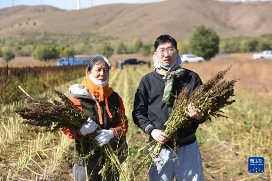10月1日,在沽源縣白土窯鄉(xiāng)小西溝村,當(dāng)?shù)胤N植戶王秀梅和她的兒子趙擎宇抱著收獲的紅藜麥合影。
