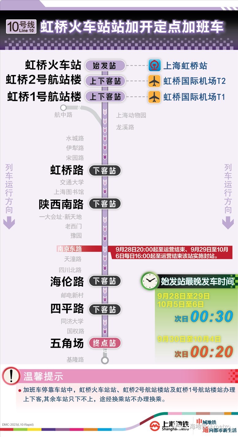 此外,9月28日20:00至運營結(jié)束,以及9月29日至10月6日的每日16:00至運營結(jié)束,地鐵2、10號線南京東路站,14號線豫園站計劃實施封站跳停。