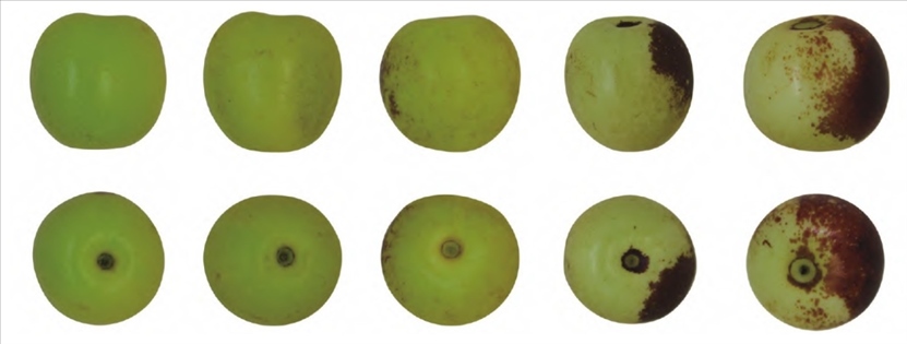 ▲從左至右依次為綠熟期、白熟期、點紅期、1/3 紅期、半紅期的果實