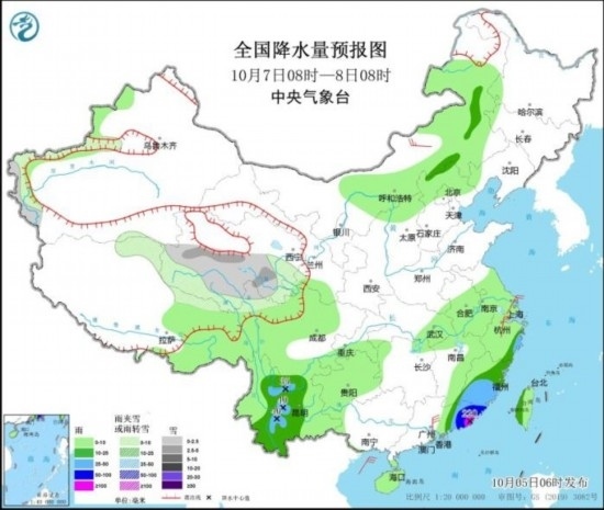 10月5日08時(shí)至6日08時(shí),青海中西部、甘肅西部、西藏北部等地有小到中雪或雨夾雪,青海西北部局地有大雪,西藏東南部、陜西中南部、四川北部和東南部、貴州西北部、云南東北部、臺(tái)灣島等地部分地區(qū)有大到暴雨,其中,臺(tái)灣島東部部分地區(qū)有大暴雨,局地特大暴雨(250~320毫米)。內(nèi)蒙古中東部、黑龍江東北部、湖南北部、浙江等地部分地區(qū)有4~6級(jí)風(fēng)。