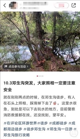 10月3日,游客艾女士(化名)發(fā)布圖片稱,當(dāng)天下午2點(diǎn)左右,在鄧生溝徒步,有人照相時(shí)踩滑掉落水里,水流非常湍急?!笆钦驹谑^上照相,踩滑了掉下去。聽(tīng)到落水者兒子哭著給家里人打電話說(shuō)的?!彼€向上游新聞?dòng)浾弑硎荆渌呤且晃慌慰?,事情發(fā)生后,警方、消防等都在展開(kāi)救援。多位游客表示,該女游客已被找到,不過(guò)已經(jīng)去世。