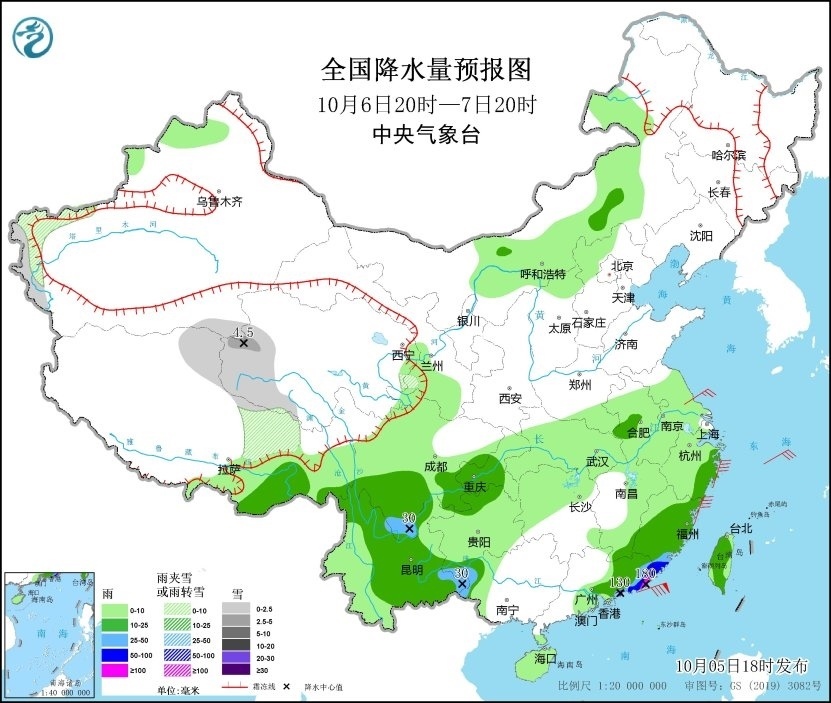 10月5日20時至6日20時,西藏東北部、青海中南部和東北部、甘肅西北部等地部分地區(qū)有小到中雪或雨夾雪,青海西北部局地有大雪;西藏東南部、陜西南部、四川盆地東部、重慶、貴州西部、云南東北部、湖北西部、廣東東部沿海、福建南部及臺灣島南部等地部分地區(qū)有中到大雨,其中,西藏東南部、臺灣島南部等地部分地區(qū)有暴雨(50~75毫米)。西藏西部、四川盆地中部等地有5~6級風、陣風7級,浙江沿海、福建沿海、廣東東部沿海、臺灣島西北部沿海等地有6~8級風、陣風9級(見圖1)。
