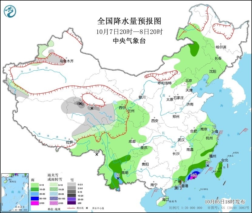 10月7日20時至8日20時,青海中南部、西藏東北部、新疆西部等地部分地區(qū)有小雪或雨夾雪,青海中部局地有中到大雪;四川南部、云南中部、浙江南部、福建南部、廣東東部、臺灣島等地部分地區(qū)有中到大雨,其中廣東東部、福建南部、云南南部等地部分地區(qū)有暴雨,廣東東部沿海地區(qū)局地有大暴雨(100~240毫米)。浙江、福建和廣東沿海等地有4~6級風、陣風7級;東海西南部及中部海域、臺灣海峽、南海東北部偏北海域有6~7級風、陣風8~9級(見圖3)。
