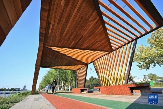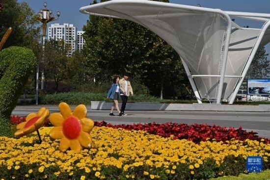 10月15日,市民從唐山市海港經(jīng)濟(jì)開發(fā)區(qū)城市休閑驛站走過(guò)。