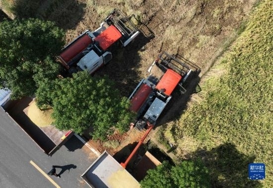 10月18日,湖南省衡陽市衡山縣白果鎮(zhèn),農(nóng)民在收割晚稻(無人機(jī)照片)。