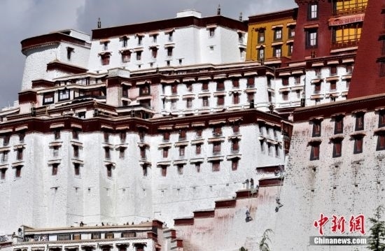 10月19日,西藏拉薩,工作人員對布達(dá)拉宮外墻噴灑涂料。每年秋冬交替時節(jié),布達(dá)拉宮外墻都要進(jìn)行粉刷“美顏”。按照慣例,每季粉刷將在藏歷9月22日“神降節(jié)”前完成。