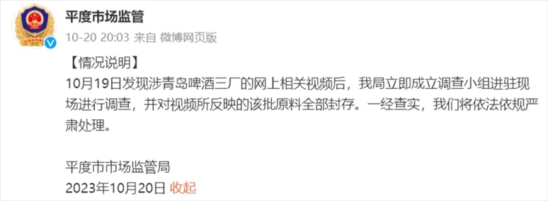 《每日經(jīng)濟(jì)新聞》記者注意到,青島啤酒三廠所在地的平度市市場監(jiān)管局也發(fā)布情況說明稱,10月19日發(fā)現(xiàn)涉青島啤酒三廠的網(wǎng)上相關(guān)視頻后,我局立即成立調(diào)查小組進(jìn)駐現(xiàn)場進(jìn)行調(diào)查,并對視頻所反映的該批原料全部封存?!耙唤?jīng)查實,我們將依法依規(guī)嚴(yán)肅處理?!?/p>
