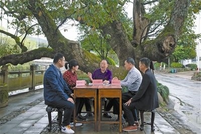 圖①:巡回審判。圖為諸暨法院法官在東溪村百年古樟樹下開展巡回審判,依法對兩起非法狩獵的刑事案件進(jìn)行公開審理并當(dāng)庭宣判。