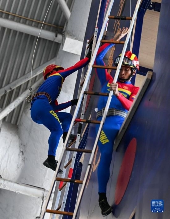 11月8日,消防員在進(jìn)行攀登掛鉤梯比賽。