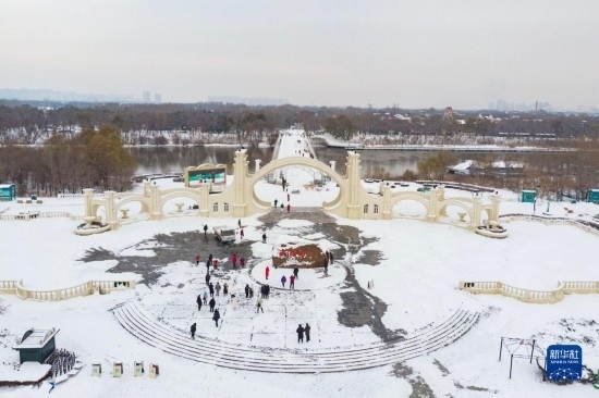 11月9日,人們在太陽島景區(qū)門前清掃積雪、游玩拍照(無人機(jī)照片)。