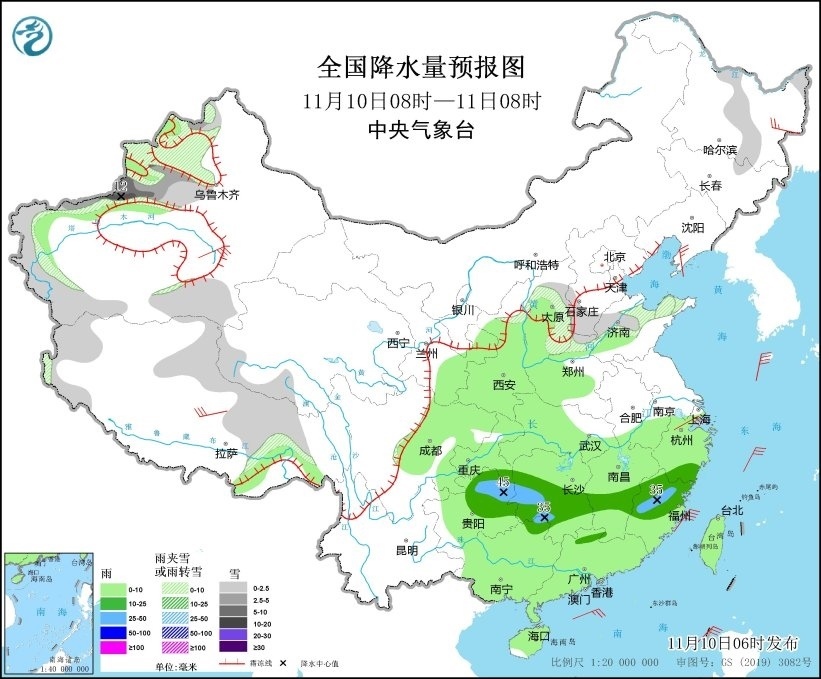 11月10日08時至11日08時,新疆西部和南疆南部、西藏西部和北部、青海南部、黑龍江東部、吉林北部、山西北部、河北南部、山東西部等地部分地區(qū)有小到中雪或雨夾雪,其中,新疆伊犁河谷和沿天山一帶等地部分地區(qū)有大雪,局地暴雪(10~12毫米)。重慶東南部、貴州東部和北部、湖南中南部、江西中南部、浙江南部、福建中北部以及廣西東北部等地部分地區(qū)有中雨,其中,貴州東北部、湖南西部、福建西北部等地部分地區(qū)有大雨(25~45毫米)。黑龍江東北部、遼東半島、新疆南疆盆地、西藏北部、浙江北部等地部分地區(qū)有4~6級風(見圖4)。