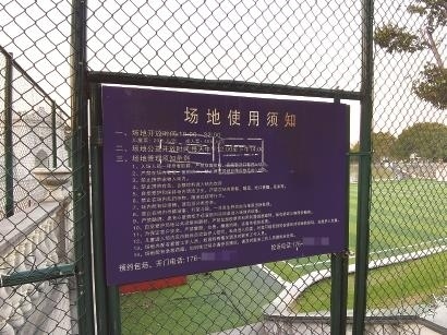 賢園足球場的“場地使用須知”牌。從上面羅列的條款得知,該球場僅中午12時至下午2時是公益免費(fèi)開放時段。?