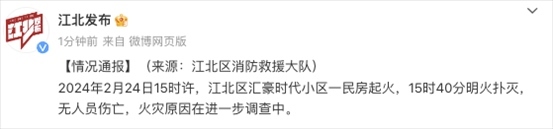 寧波某小區(qū)一民房起火,無人員傷亡 江北區(qū)消防救援大隊(duì)通報(bào),2月24日15時(shí)許,江北區(qū)匯豪時(shí)......